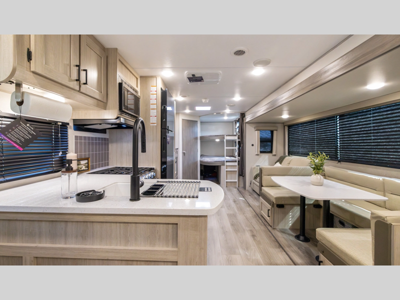 Sleeps 10 Slides 1 Length 33 ft 8 in Ext Width 8 ft Ext Height 11 ft 1 in Int Height 6 ft 9 in Hitch Weight 834 lbs GVWR 9264 lbs Dry Weight 7264 lbs Cargo Capacity 2000 lbs Fresh Water Capacity 38 gals Grey Water Capacity 42 gals Black Water Capacity 28 gals Furnace BTU 35000 btu Number Of Bunks 3 Available Beds RV Queen Refrigerator Type GE Stainless 12V Refrigerator Size 10.7 cu ft Cooktop Burners 3 Number of Awnings 1 LP Tank Capacity 20 lbs Water Heater Type Tankless On Demand AC BTU 13500 btu Awning Info 18' Electric w/Multicolor LED Strip & Remote Axle Count 2 Number of LP Tanks 2 Shower Type Standard Electrical Service 30 amp Similar Floorplans