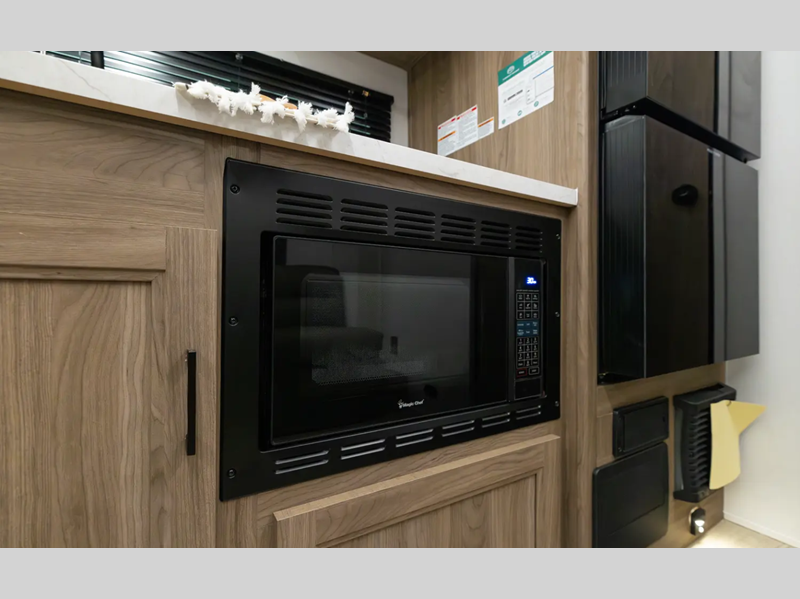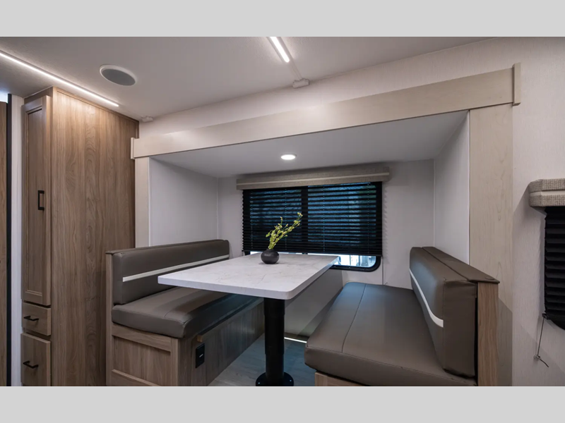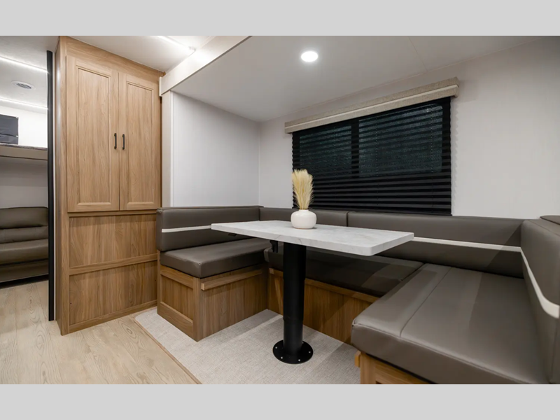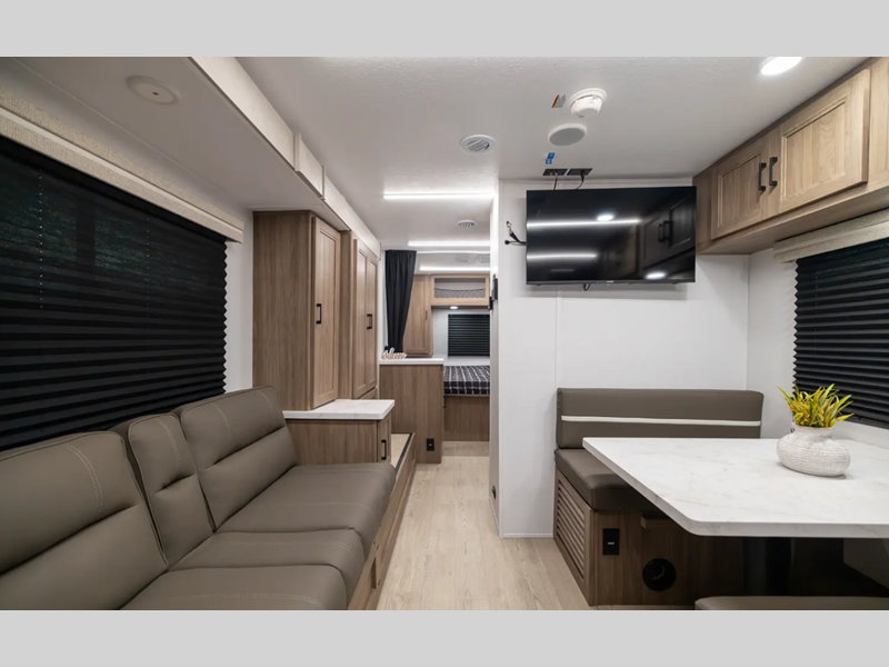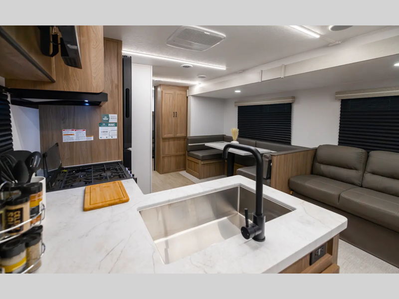 With each model you will find a heated and enclosed underbelly, Dicor Tufflex PVC Roofing, and Dexter E-Z Lube axles for smooth towing. The velarium velocity switch power awning with light strip will provide an inviting outdoor living space, and there is a convenient pet leash and bottle opener. Inside, you will appreciate the wear-resistant vinyl flooring and the night shades for privacy. These travel trailers also include a power tongue jack so you can easily hitch up and head out!