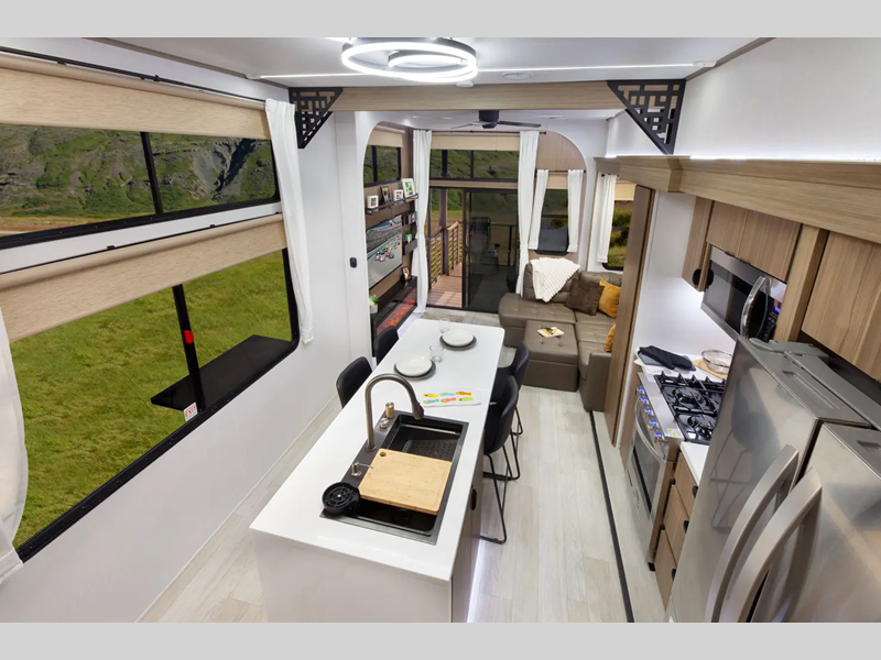 You will love the residential features, such as a Serta mattress in the bedroom, stainless steel kitchen appliances, and solid surface countertops. There are also adjustable textured roller shades, a 60k on-demand tankless water heater, and a 106" interior height in the living room for added space. Outside, 4K awning "Blade Lighting" will keep your space well illuminated, while JBL speakers let you listen to your favorite tunes.